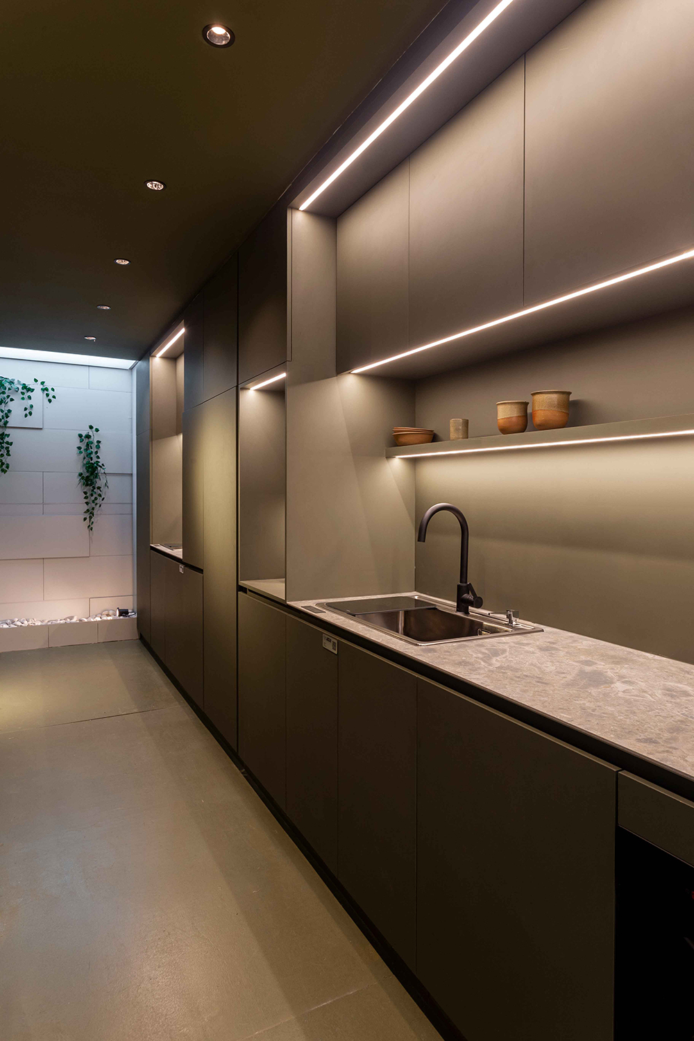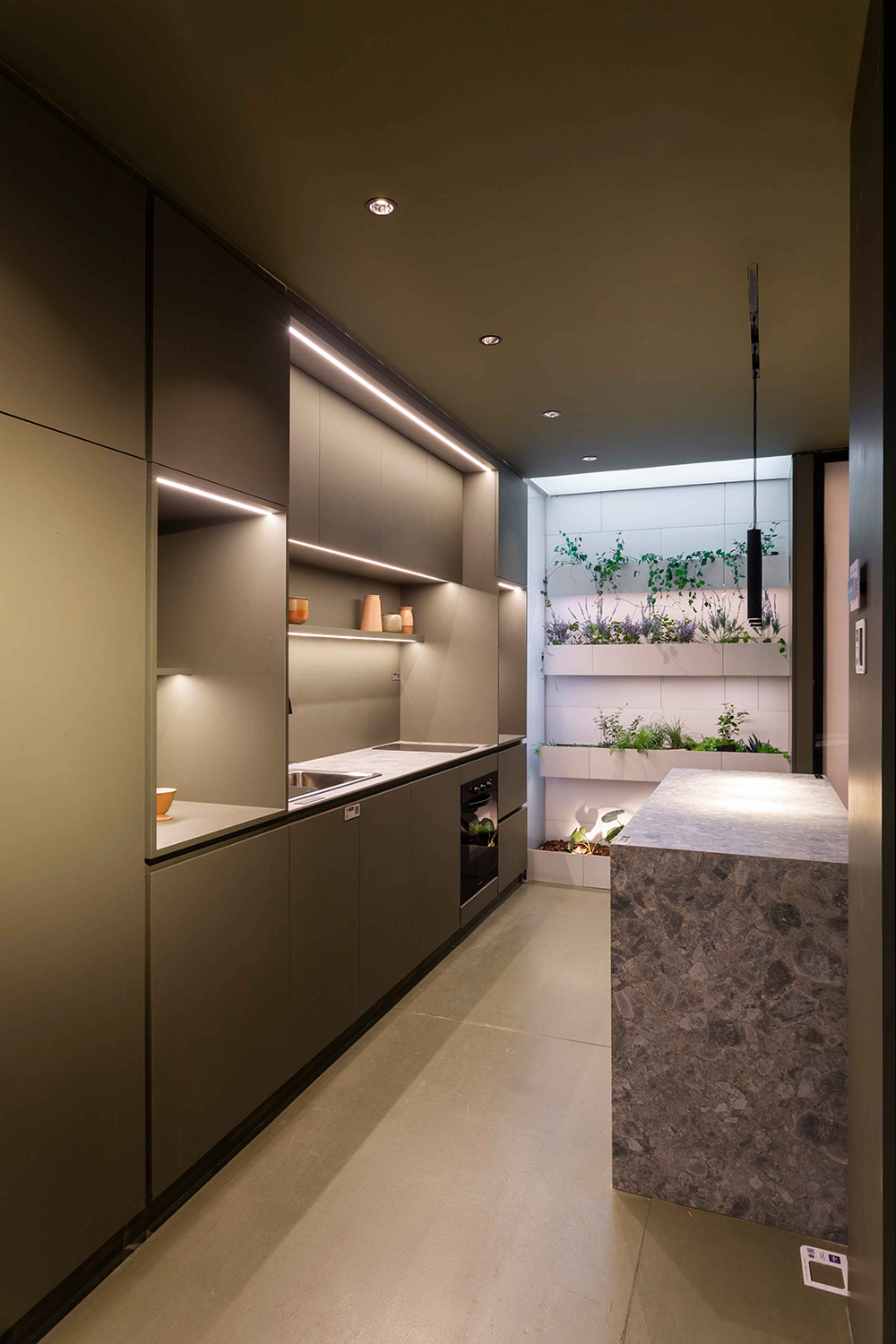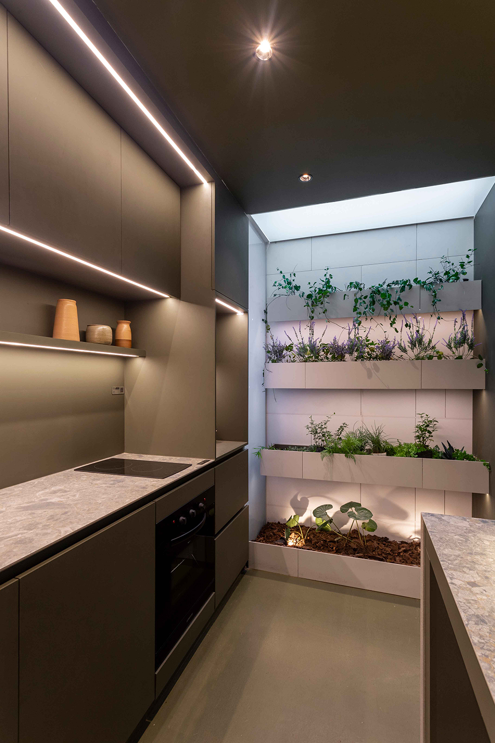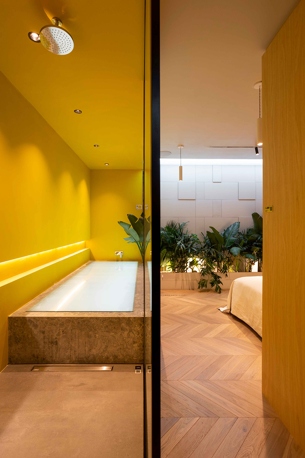 Esto se logra concentrando todas las funciones residenciales dentro de cuatro cajas de madera que se alojan en el perímetro del espacio. A lo largo de este perímetro se encuentran también, entrecortadas por las cajas de madera, cajas repletas de plantas generando una doble piel, proveyendo así frescura y oxígeno, convirtiéndose en intermediarias entre la caja exterior y la ciudad.